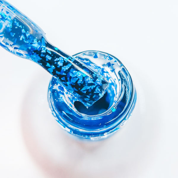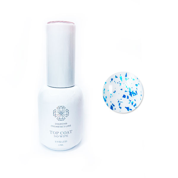 Top de alto brillo con decoración de foil incorporada de densidad media. Gran resistencia a los arañazos. Apto para cualquier sistema de esmaltado semipermanente, gel, polygel y acrílico. Sin capa de dispersión. Polimerizacion: LED – 120S. UV – 4min. CCFL – 120S.